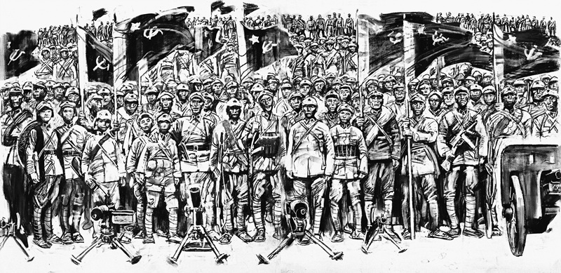 ??《長征·1936》連環(huán)畫三部曲:一《奠基禮》(中央紅軍到陜北);二《大回旋》(紅二、六軍團征戰(zhàn)湘黔滇);三《大會師》(紅一、二、四方面軍大會師)??傆?00幅,沈堯伊編繪。2012年至2014年創(chuàng)作。