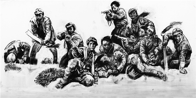??的確,長征精神中,那份大美、悲壯、樸素,卻近乎于浪漫的理想,總是讓他心向往之。從青年時期創(chuàng)作的《而今邁步從頭越》《革命理想高于天》,到譜寫連環(huán)畫巨著《地球的紅飄帶》,再到后來的姊妹篇《長征·1936》《征路星火》,沈堯伊先生始終執(zhí)著于表現長征。二萬五千里,中國共產黨人用自己的腳步和鮮血鐫刻于這個星球,猶如一根鮮艷奪目的紅飄帶。這是中國人的史詩,也是世界人的史詩。藝術家懷抱對長征精神的熱情,多次重走長征路,為老一輩革命者的理想所折服,為他們的精神與氣節(jié)所感動。而他飽含情感的記錄與描繪,充溢創(chuàng)造力的表現方法,更讓作品閃爍著人性的光輝,激勵與感動著每一位觀者,使他們在審美之余,獲得了思想教益和精神鼓舞。