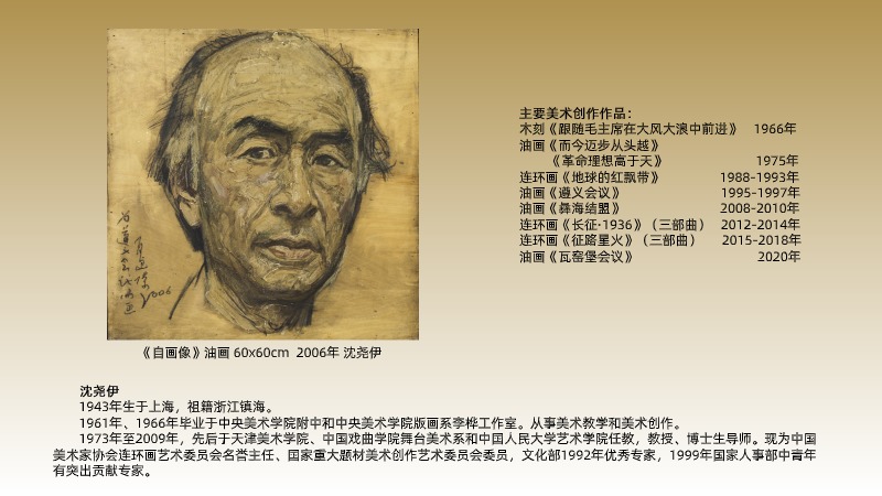??沈堯伊先生是中國美術界對長征題材體驗最多、感受最深、創(chuàng)作最旺的一位畫家,他邁逾50余年的藝術生涯與反映黨的光輝歷程的革命史詩繪畫相連,真正做到用長征精神來畫好長征,堅實地在藝術史上占有了位置。70年代他的《革命理想高于天》《而今邁步從頭越》等早期油畫,以濃郁的革命戰(zhàn)斗氣息和昂揚的時代精神,贏得廣泛好評,成為當時引人注目的大作;80年代末至90年代初,他潛心六年創(chuàng)作了長達926幅的長征史詩連環(huán)畫《地球的紅飄帶》,以強烈的心靈震撼和酣暢的藝術審美感受力,為歷史深處的長征添注了時代的文化精神,成為進入歷史的藝術巨構;90年代他投入大型油畫《遵義會議》的創(chuàng)作中,在視覺審美之境中再現長征中這一偉大歷史轉折的人物群像,實現歷史真實和藝術真實的高度統(tǒng)一;進入新世紀,他步履不停地重走長征路,完成《長征之路》風景畫系列、《長征交響》風景和風俗組畫,在光和色、現實和歷史的游弋中譜寫長征之情。正是懷著深深的“長征情”,沈堯伊對長征和長征精神開展了長達幾十年的藝術探索,在連環(huán)畫、油畫的創(chuàng)作媒介中均達到了一種極致的追求,即對長征和長征精神的歷史性、紀實性、藝術性、象征性和民族性的全方位審美創(chuàng)造。