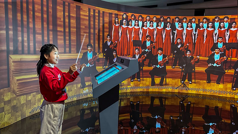 作品名稱:人人都是指揮家 創(chuàng)作團隊:國家大劇院 創(chuàng)作時間:2024年 作品類型:互動影像裝置 作品說明:《人人都是指揮家》項目是由國家大劇院在 2024年推出的實驗性交互裝置。該項目融合了體感識別技術(shù)與音頻動態(tài)映射技術(shù),并通過人工智能算法。多維數(shù)據(jù)解析,實現(xiàn)了一種探家指揮古典音樂演奏的全新方式。