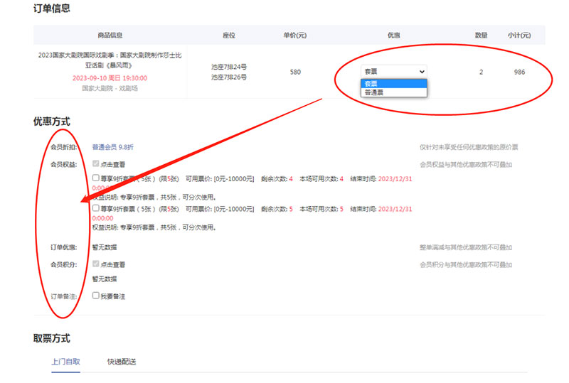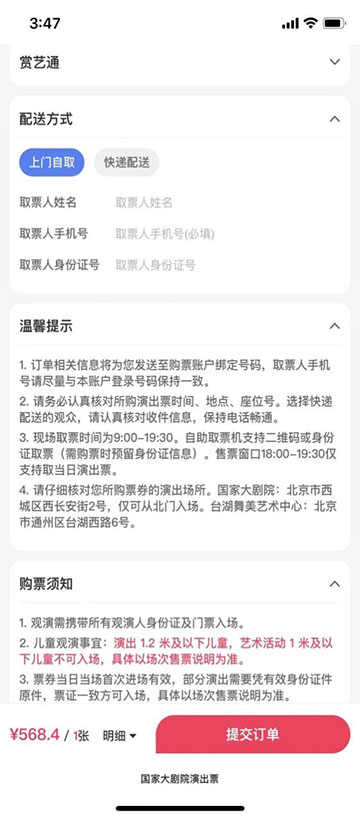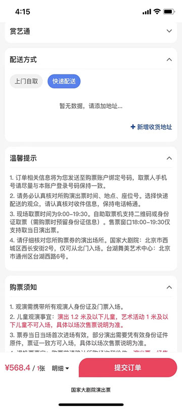 ??5、確定好演出信息及票價(jià)后,選擇取票方式,上門(mén)自取和快遞配送(目前僅支持北京全境快遞,外省市暫不提供演出票快遞配送服務(wù))。