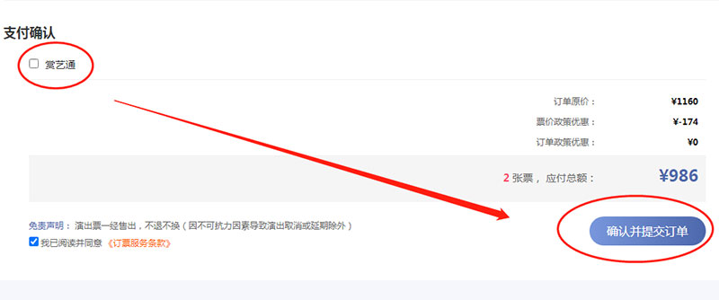 ??6、購(gòu)票信息確定后,在頁(yè)面下方左側(cè)查看是否通過(guò)賞藝通賬號(hào)及余額,可勾選“賞藝通”進(jìn)行支付。如無(wú)需使用賞藝通付款,則點(diǎn)擊頁(yè)面下方“確認(rèn)并提交訂單”按鈕。