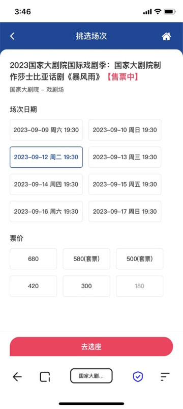 ??2、 進(jìn)入演出信息詳情頁(yè),根據(jù)演出相關(guān)內(nèi)容,點(diǎn)擊“日期/場(chǎng)次”后,選擇相應(yīng)票檔, 點(diǎn)擊“選座購(gòu)買(mǎi)” 。