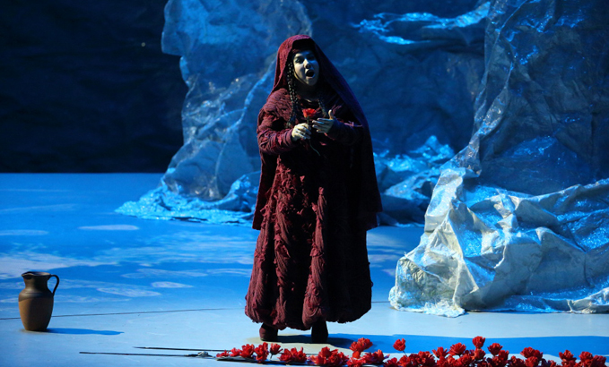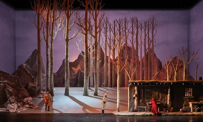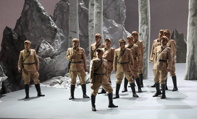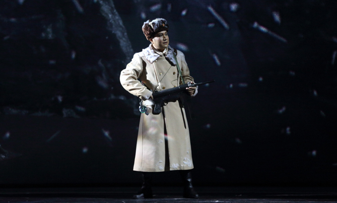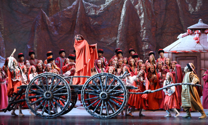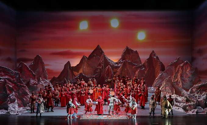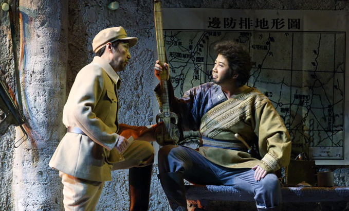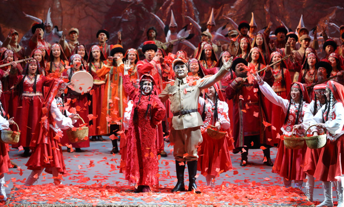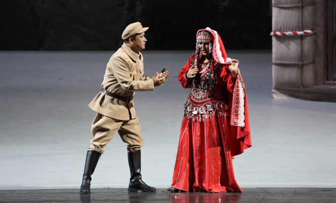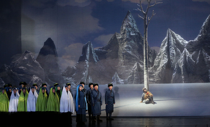 山的另一邊,古蘭丹姆(真)被迫為土匪頭子江罕達(dá)爾做奴仆,她歌唱著冰山雪蓮,述說心中悲傷和希望。