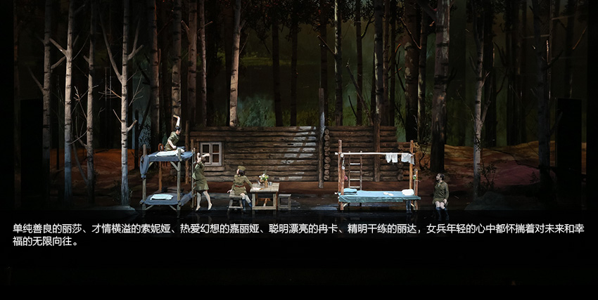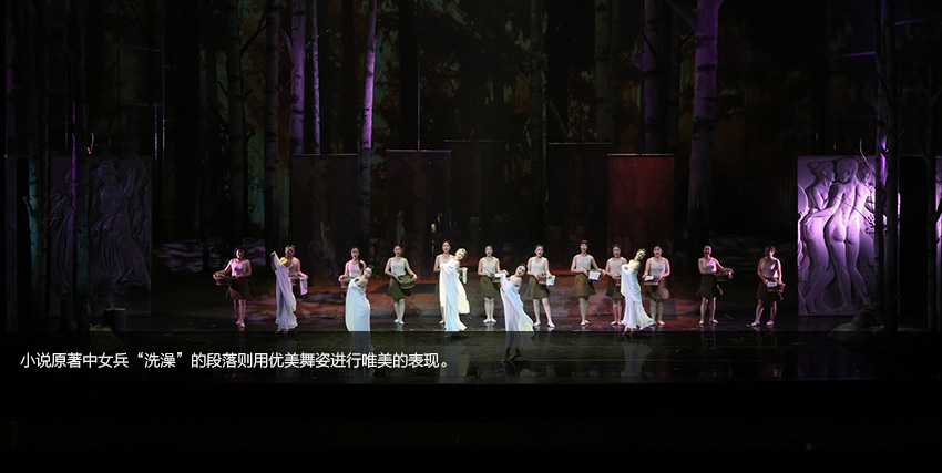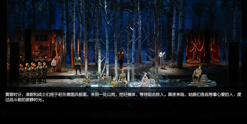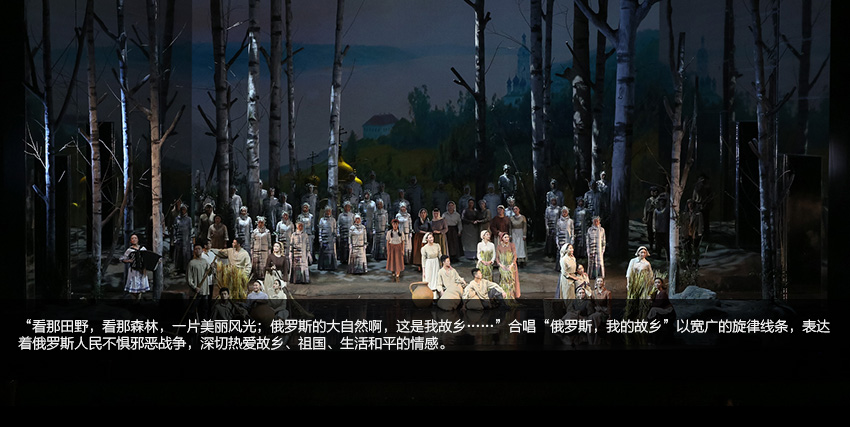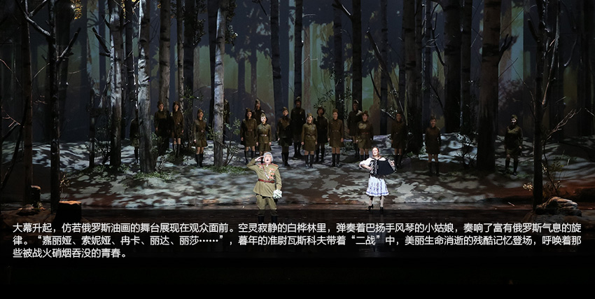 當(dāng)女兵的美麗身軀與芭蕾舞演員的曼妙舞姿交相輝映,當(dāng)戰(zhàn)士、村民與身著民族服裝的舞者乃至幾位幻想中的人物同在一片白樺林中跳起圓舞時(shí),我們幾乎忘記了嚴(yán)酷的戰(zhàn)爭甚至忘記了生活現(xiàn)實(shí)……
