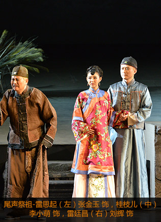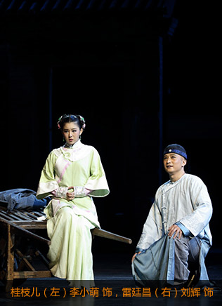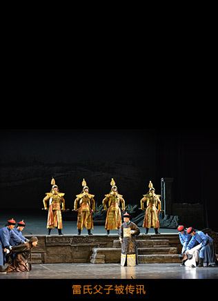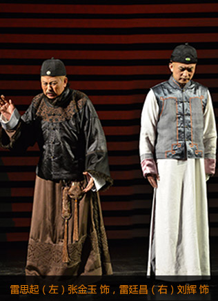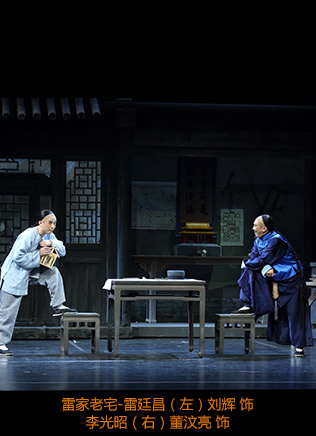 劇中有兩條線,一條是雷氏父子的遭遇和行為,在舞臺(tái)上直接表現(xiàn);另一條是十分重要的宮廷政治斗爭(zhēng),這是影響和決定慈禧行為的真正動(dòng)因,是樣式雷遭遇產(chǎn)生的情境。這條線雖然重要但是虛寫(xiě),由說(shuō)書(shū)人敘述介紹。