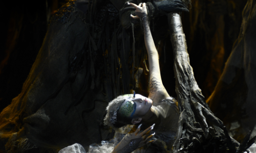 林中生靈的簫聲,喚醒悲痛中的孔雀,親歷愛(ài)恨情仇與生命無(wú)常的薩朵,與神靈對(duì)話,從而覺(jué)察生命的真相,了知愛(ài)的真意,化解了悲痛與仇恨,歸于寧?kù)o,在象征生命的最后階段的冬天,她一層層褪去了束縛自己靈魂的華麗羽衣,平靜的走過(guò)這個(gè)世界。