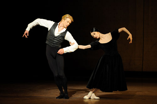 《茶花女》對(duì)于人物心理的細(xì)膩刻畫及戲劇情節(jié)的巧妙描摹,堪稱“戲劇芭蕾”的經(jīng)典,許多段落的精彩設(shè)計(jì)充分運(yùn)用了舞蹈及舞臺(tái)藝術(shù)的特長(zhǎng),令人大呼過癮、拍手叫絕。其中一段以同是“交際花”身份出現(xiàn)在芭蕾舞臺(tái)上的名伶曼儂,影射茶花女悲慘命運(yùn)的舞段不僅舞蹈編排精彩絕倫,隱逸其中的人物內(nèi)心的掙扎與微妙變化,更是以令人意想不到的手法被巧妙的展現(xiàn),給人以視覺與心靈的雙重震撼。