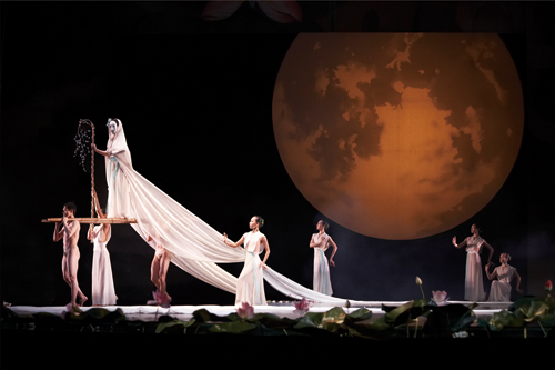 美國(guó)華裔舞臺(tái)設(shè)計(jì)泰斗李名覺(jué)從林懷民強(qiáng)調(diào)的楚地水澤繁花的意象出發(fā),引用臺(tái)灣前輩畫(huà)家林玉山畫(huà)作《蓮池》,創(chuàng)作了荷葉荷花滿天的景片,劇院樂(lè)池化為水汪汪的池塘,田田荷葉托出粉色荷花。在這個(gè)神龕式的舞臺(tái)上,舞者以融合東西的肢體語(yǔ)言,透過(guò)《東君》、《司命》、《湘夫人》、《云中君》、《山鬼》、《國(guó)殤》等章節(jié),描繪情欲、孤獨(dú)、操控、抗?fàn)?、死亡與復(fù)活。舞至終結(jié),《禮魂》的八百盞油燈蜿蜒如河,流向繁星的夜空。