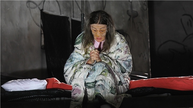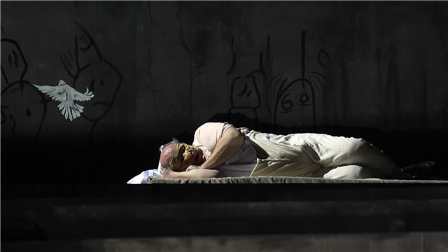 莉娜·貝克曼飾演的艾勒身著藍(lán)色緊身尼龍裙,從舞臺(tái)后部的碉堡樓梯上蹣跚而下,步態(tài)因過(guò)高的高跟鞋而顯得顫顫巍巍,好像隨時(shí)有可能跌落。當(dāng)她走到前部后,夸張的肢體顫栗和面部表情配合的天衣無(wú)縫:神經(jīng)質(zhì)般、因驚慌失措而瞪大的雙眼、一張一翕的下顎、抽搐痙攣的嘴唇,這個(gè)表面看上去病入膏肓的女人可以在一瞬間耗盡自己所有的情感,她聒噪不休、奮力殘喘,似乎可以使堅(jiān)實(shí)的墻壁顫抖。