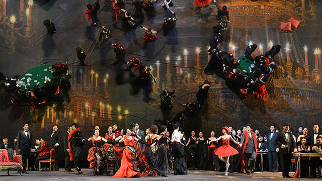 第一幕,小快板、降B大調,3/8拍。它是這部歌劇中最通俗、最膾炙人口的唱段。男主角阿爾弗萊德在薇奧萊塔的宴會上舉杯祝賀,用歌聲傾訴對她的愛慕之心。最后一段客人們的合唱也為這首歌增添了熱烈氣氛。這首單二部曲式的分節(jié)歌以輕快的舞曲節(jié)奏、明亮的色彩及六度大跳的旋律動機貫穿全曲,表現了主人公對真誠愛情的渴望和贊美,充滿青春的活力。同時又描繪出沙龍舞會上熱鬧、歡樂的情景。