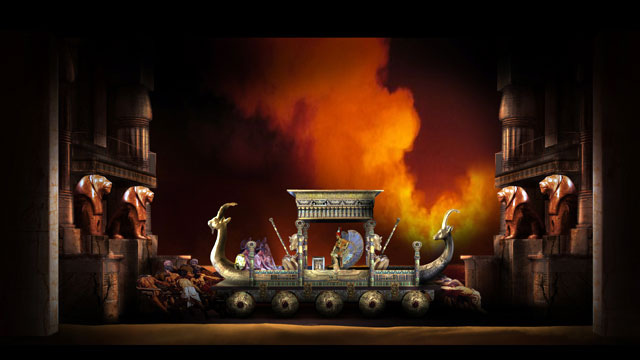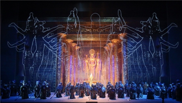 第四幕,第四場。阿依達(dá)與拉達(dá)梅斯殉情的二重唱。盡管他們是被判決活埋處死的,但這也是他們在面臨忠貞考驗(yàn)時(shí)決然的自我選擇。死亡對于這一對注定無法終成眷屬的癡情男女而言,或許是別無選擇的解脫,也是浪漫主義時(shí)期悲劇作品最眾望所歸的結(jié)局。當(dāng)石墓的門被石磚封死,墓室里的氧氣迅速稀薄,兩個(gè)人的呼吸越發(fā)困難,但卻在平靜相擁之中完成了靈魂的結(jié)合與升華。威爾第的妙筆將這種生理上的痛苦與精神上愉悅?cè)诤显谝黄穑恳粋€(gè)向上飛升的樂句似乎都無力唱完,卻又完整的迸發(fā)著幸福感。這首二重唱與《弄臣》、《茶花女》最后的二重唱一樣,用充滿虔誠與幸福感的音樂,倍升悲劇性的結(jié)局的感染力。