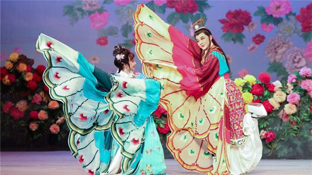 ??英臺聞耗,身穿孝服到山伯墳前祭奠。忽然風(fēng)雨大作,雷電交加,墳?zāi)沽丫`,英臺也乘勢躍入墓中。霎時雨止天晴,一雙蝴蝶從墓中飛出,翩翩而舞。