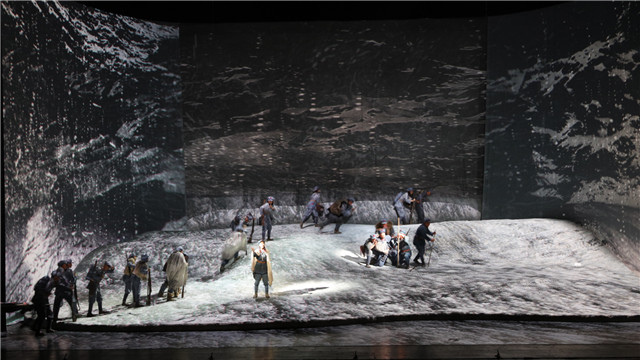 第五幕第二場中紅軍爬雪山時紅軍女戰(zhàn)士萬霞的一段悲愴而優(yōu)美的詠嘆調(diào)。在低沉、渾厚的男聲合唱襯托下,萬霞的女高音獨唱時而空靈飄逸、時而激越昂揚,樂隊響起凄美而堅強的間奏樂段,充分刻畫岀紅軍戰(zhàn)士們在迎著飛舞的雪花艱難跋涉、攜手前行中依然保持著堅定革命理想和純潔高尚的情懷。