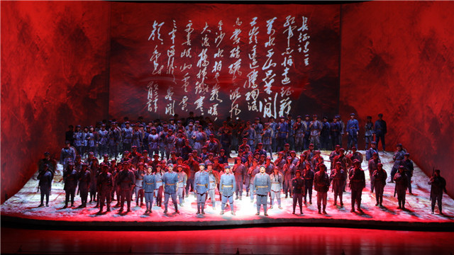 第四幕中表現(xiàn)紅軍在大渡河沿岸長途急行軍、飛奪滬定橋的戰(zhàn)斗場景。前曲是一首昂揚的男聲合唱,在樂隊連續(xù)急速的三連音背景下,紅軍戰(zhàn)士的歌聲堅定有力、一往無前,緊接后曲是彭政委一段“急板詠嘆調(diào)”,在動員戰(zhàn)士們“快點!再快點!”的同時,又發(fā)出“百年前被殺的石達開三萬鐵騎啊,請你們張開眼看看今天的紅軍戰(zhàn)士是怎樣不懼艱險”的豪邁贊嘆。兩首唱段緊密相連,音樂飛速而洶涌澎湃,旋律變化多端,展現(xiàn)岀紅軍大無畏的革命精神和勇猛斗志。