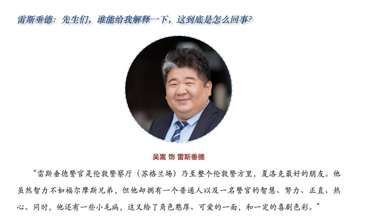 ??我們的話(huà)劇《嫌疑人福爾摩斯》,是在原著的基礎(chǔ)上創(chuàng)作的新故事——夏洛克·福爾摩斯疑似走上了犯罪道路、兄長(zhǎng)麥克羅夫特決定大義滅親、好友華生醫(yī)生進(jìn)退兩難……我們?cè)噲D以新的情景假定,去探索夏洛克、華生、麥克羅夫特、雷斯垂德等角色在新的故事可能下展現(xiàn)的新的魅力。