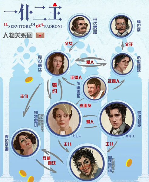 ??這位“死而復生”的未婚夫,其實是他的妹妹別特里切女扮男裝,她此行的目的是尋找她流亡的戀人弗洛林多。這對有情人卻意外的雇傭了同一個仆人——為多掙一份錢而同時偷偷打兩份工的圖法蒂諾。