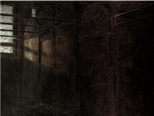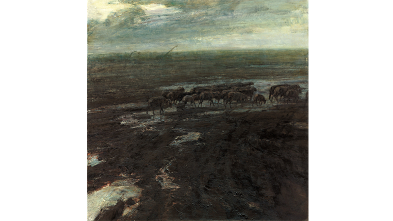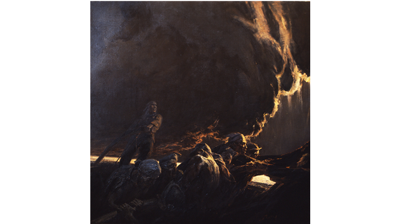 ??鐘涵筆下的恒常主題是人與自然的艱苦關(guān)系,他用凝重的筆觸和濃重的色彩,表現(xiàn)人與黃土高原、人與黃河等自然艱苦環(huán)境拼博的精神,表現(xiàn)人類堅(jiān)強(qiáng)不屈的悲壯氣概。這兩種視覺再現(xiàn)表達(dá)對(duì)人和世界的不同旨趣,產(chǎn)生了不同的美學(xué)形態(tài)。在靳尚誼的畫中,形式清晰,線與色皆在界定人物和事物邊線與內(nèi)在體積,所塑造的形體可感可觸,整體畫面結(jié)構(gòu)清楚朗暢。鐘涵作品的畫旨與此形成鮮明反差,一切形體融化在神秘莫測(cè)的形相氛圍之中,借助風(fēng)、云、煙、火等不可觸摸的形狀增強(qiáng)筆觸在畫面的運(yùn)動(dòng)感,創(chuàng)造渾然一體的視覺撼動(dòng),其濃黑厚重的畫面中,常常以些許跳躍的亮色導(dǎo)引觀者之眼,于其構(gòu)圖的整體上下文中去讀解具體的形式。正是出于這樣的暗示性繪畫觀念,他在畫人物時(shí)往往選擇背面,以寬大的筆觸加以塑造,象征人性的鐵鑄般的脊梁之柱。