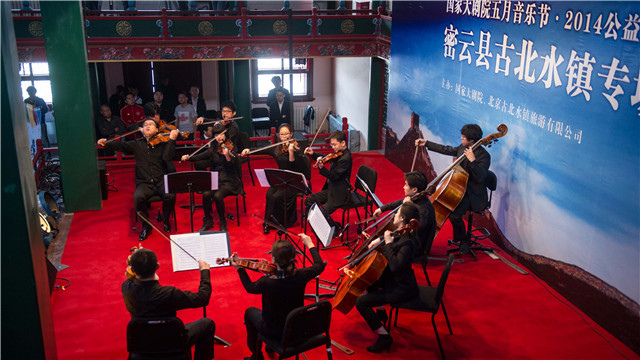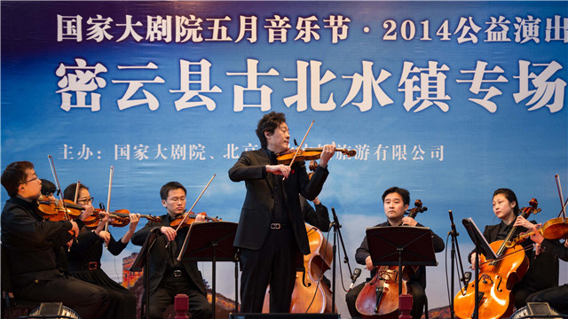 5月4日上午十點半,小提琴家呂思清與國家大劇院管弦樂團(tuán)的俊杰們來到密云古北水鎮(zhèn)。雖然此前五月音樂節(jié)已走進(jìn)過京城大大小小的角落,但來到這樣古香古色的小鎮(zhèn)還是第一次。小鎮(zhèn)中鱗次櫛比的房屋,青石板的老街,悠長的胡同,無不展現(xiàn)了北方民國時期的古鎮(zhèn)風(fēng)貌,音樂家們的到來,又為這一風(fēng)景秀麗的畫卷增添了一抹音樂的靈動。這場音樂會還特別邀請到央視著名主持人任魯豫現(xiàn)場助陣,在演奏間隙為藝術(shù)家與觀眾牽線,進(jìn)行了非常輕松愉悅的交流互動。值得一提的是,作為世界級的演奏家,呂思清不僅是五月音樂節(jié)的老朋友,而且在向公眾推廣室內(nèi)樂方面也一直不遺余力。在本屆五月音樂節(jié)中,呂思清自己及美杰三重奏都將分別出現(xiàn)在大劇院舞臺和院外公益演出的現(xiàn)場,可謂是不折不扣的室內(nèi)樂推廣“勞?!薄!白詮奈逶乱魳饭?jié)推出公益演出活動,對于讓室內(nèi)樂這種音樂形式能夠更好地走近觀眾起到了特別好的作用??赡苓€有很多對古典音樂感興趣但不知道怎么去欣賞的觀眾,‘走出去’就好比伸出雙手去邀請大家,讓更多人有機(jī)會接觸和認(rèn)識到室內(nèi)樂之美。而且通過這樣一種比較輕松的溝通,也可以讓大家了解音樂和音樂家背后的故事,同時也讓我們了解到觀眾希望聽到什么,感受到什么?!眳嗡记逭f。