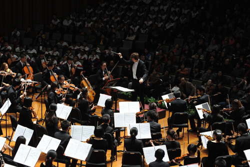 本次音樂(lè)會(huì)是一次“大手拉小手”的藝術(shù)教育新形式的有益嘗試。國(guó)家大劇院管弦樂(lè)團(tuán)擁有眾多曾在全國(guó)和世界大賽上獲獎(jiǎng)的杰出演奏家,其大部分成員都有國(guó)際化的學(xué)習(xí)工作經(jīng)歷。而音樂(lè)會(huì)上與國(guó)家大劇院管弦樂(lè)團(tuán)同臺(tái)演出的是北京市東直門中學(xué)金帆交響樂(lè)團(tuán)、北京市第二十二中學(xué)金帆交響樂(lè)團(tuán)和北京八中金帆交響樂(lè)團(tuán)的優(yōu)秀小演奏員。音樂(lè)會(huì)發(fā)揮“傳幫帶”的優(yōu)良傳統(tǒng),演奏家們不僅能夠給同學(xué)們更多的專業(yè)指導(dǎo),更將藝術(shù)的美好和希望留給了高雅藝術(shù)的后繼力量。