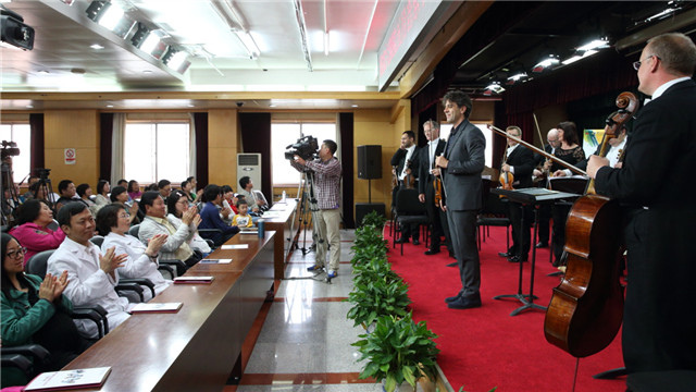小提琴家黃蒙拉(中)與斯洛伐克小交響樂團將精挑細選的莫扎特音樂送到了北京婦產(chǎn)醫(yī)院 王小京/攝