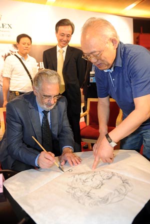 發(fā)布會(huì)上,著名畫家李延聲(右前)為多明戈大師現(xiàn)場(chǎng)畫像 羅曉光/攝