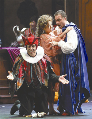 (記者 張學(xué)軍)和前兩次一樣,《弄臣》第二幕那個(gè)著名的詠嘆調(diào)《狗強(qiáng)盜》之后,有著“天下第一弄臣”美譽(yù)的里奧·努奇跪地享受著觀眾的掌聲。與女高音蘭卡托的“復(fù)仇二重唱”也再現(xiàn)了幕間返場(chǎng)的盛況。