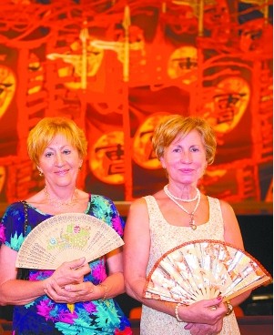 7月4日,在匈牙利布達(dá)佩斯,兩名女士在京劇《赤壁》的布景前合影。