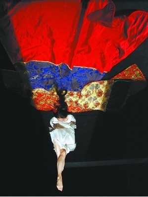 7月18日和19日,由丁偉導(dǎo)演的《云中漫步》則運(yùn)用概念化的方法對(duì)民族舞蹈的元素進(jìn)行提煉。在這里,沒有少數(shù)民族舞蹈成套動(dòng)作的組合,沒有對(duì)某種少數(shù)民族舞蹈結(jié)構(gòu)規(guī)律的嚴(yán)格遵循,甚至沒有一定要保證某個(gè)舞種風(fēng)格純正的努力。