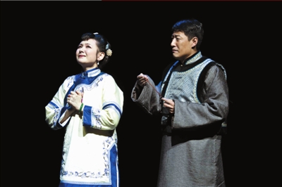4月19日晚,在演出之前,大劇院戲劇場(chǎng)門口,搭建了帽子店、茶館等王府井老店鋪實(shí)景,還有擔(dān)著剃頭挑子的、拉著黃包車的、彈著單弦的活體抹銅雕塑陪觀眾照相。真人扮演的貝勒和格格也在門外招呼著客人,讓觀眾提前感受到“金街”的熱鬧場(chǎng)面。走進(jìn)劇場(chǎng),舞臺(tái)上寫意的設(shè)計(jì)并不復(fù)雜,若隱若現(xiàn)的城樓和舞臺(tái)中央的一口井讓觀眾立刻感覺到王府井這條金街的印記,懸掛在舞臺(tái)上方的是“全素劉”、“東興樓”、“東來順粥攤”、“吉祥劇院”、“仙人居”等北京的老字號(hào)招牌。