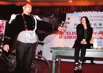 (記者 張偉/許青紅)國(guó)家大劇院自制歌劇《愛(ài)之甘醇》將于9月10日再度上演。昨天(8月24日)的發(fā)布會(huì)上,兩位主演黃英、楊小勇分別著戲裝亮相,甚至把劇中的道具自行車也騎到了現(xiàn)場(chǎng),大玩了一把“情景再現(xiàn)”?!稅?ài)之甘醇》講述了一個(gè)意大利鄉(xiāng)土?xí)r代的“愛(ài)情物語(yǔ)”:一個(gè)內(nèi)向的窮小子愛(ài)上“鳳凰女”,由此引發(fā)一系列詼諧幽默的故事。在首輪《愛(ài)之甘醇》演出中便出演女主角阿狄娜的“中國(guó)夜鶯”黃英表示,阿狄娜是她最喜歡的角色之一,“她是一個(gè)有文化、有修養(yǎng),還活潑可愛(ài)的鄉(xiāng)村小富婆,你沒(méi)有辦法不愛(ài)上她”。