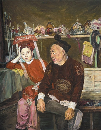 ??在后臺(tái)寫生時(shí),俞小飛也常跟贛劇團(tuán)的演員聊天。提到《母女》《一家人》等幾幅畫,俞小飛說:“有些畫是吸收了幾家人的故事,比如這幅《一家人》,在縣一級(jí)劇團(tuán)有很多演員是帶著孩子的,因?yàn)樾『⒃谀顣耙矝]人照看,有的夫妻雙方都是演員。畫的時(shí)候有時(shí)會(huì)心酸,他們的那種樸素,就像米勒畫里的農(nóng)民。演員們的生活很艱辛,很質(zhì)樸,有一種特別質(zhì)樸的情愫在里面?!?br /> ??中國的戲曲是虛實(shí)結(jié)合,西方油畫是寫實(shí)藝術(shù)。在繪畫技巧上,俞小飛也有自己的探索,“我在創(chuàng)作中也嘗試把西方寫實(shí)和中國的寫意結(jié)合起來,借鑒了很多中國傳統(tǒng)繪畫的技巧,比如落筆不改、穩(wěn)準(zhǔn)狠的用筆,以及‘得意忘形’的狀態(tài),都吸收了很多?!?br /> ??在北京大學(xué)藝術(shù)學(xué)院副院長(zhǎng)丁寧看來,《戲劇人生》令人感觸至深的力量正在于“戲劇”與“人生”的意義擺動(dòng)與多向深化,“在這里,一切都看似平淡,卻有波瀾;似乎是演戲的場(chǎng)景,又有人生的況味;好像都任其自然了,沒有任何人為的擺布,卻同時(shí)又有某種比戲劇本身更為凝重的成分;初看是一種文化現(xiàn)象的實(shí)錄,細(xì)看則能覺察出欲說還休的某種深意”。