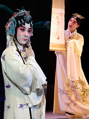 ??今年正逢公演十周年,上昆重排該劇,演員陣容會集了老中青五班三代、文武兼?zhèn)涞年嚾荨F渲械谝槐尽垛O盒情定》、第二本《霓裳羽衣》、第三本《馬嵬驚變》、第四本《月宮重圓》,每一本相對獨(dú)立,又互相銜接,四個(gè)晚上逾十個(gè)小時(shí)一氣呵成。最青春逼人的帝妃組合打頭炮,青年小生倪徐浩與青年閨門旦羅晨雪主演第一本;“梅花獎(jiǎng)”、“白玉蘭獎(jiǎng)”雙料得主、老搭檔黎安、沈昳麗主演第二本,而且黎安此行戲份頗為吃重,還出演第三晚的大軸《聞鈴》,以及與優(yōu)秀閨門旦余彬搭檔合作第四本《月宮重圓》。最激動人心的第三本《馬嵬驚變》則由本劇的藝術(shù)指導(dǎo)、兩位年逾古稀的老藝術(shù)家蔡正仁與張靜嫻聯(lián)袂主演。