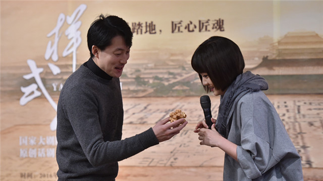新“桂枝兒”蔣小涵(右)與新“雷廷昌”天津人藝青年演員彭國(guó)斌(左)現(xiàn)場(chǎng)展示魯班鎖 羅曉光/攝