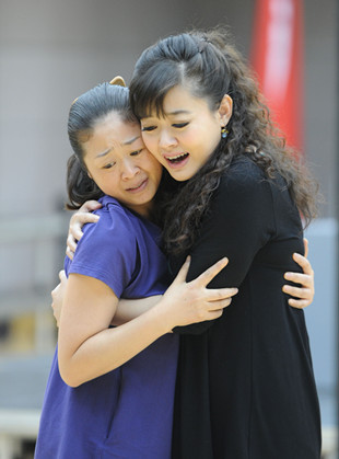 探班中四位韓英的扮演者王慶爽、張其萍、劉丹麗、馬婭琴集體亮相,令人眼前一亮。其中劉丹麗、馬婭琴為湖北省歌劇舞劇院的演員,兩人分別是老版《洪湖赤衛(wèi)隊(duì)》第三代和第四代的“韓英”,唱過數(shù)百場的《洪》劇,可謂深具“實(shí)戰(zhàn)經(jīng)驗(yàn)”;而王慶爽和張其萍則是國家大劇院專門為該劇從前后幾輪的試唱選拔中挖掘出來的“種子選手”,實(shí)力同樣不容小覷。來自總政歌舞團(tuán)的王慶爽擁有清亮有力的歌聲和英姿颯爽的臺(tái)風(fēng),表演富有感染力。當(dāng)天的活動(dòng)現(xiàn)場,王慶爽飾演的韓英就向媒體展示了被捕后與母親相見的一段戲:這是母女二人最后一次相聚,王慶爽在每一次凝望和依偎中把母女情深的一幕演繹得催人淚下,在母親面前的“柔”與在敵人面前的“剛”形成鮮明對(duì)比,令英雄的形象更加人性化。而緊隨其后的激昂的經(jīng)典唱段《看天下勞苦人民都解放》中,一句“兒死后,你要把兒埋在高坡上,將兒的墳?zāi)瓜驏|方,兒要看白匪消滅光,兒要看天下的勞苦人民都解放!”有力的唱腔、堅(jiān)定的目光、慷慨凜然的氣度贏得了現(xiàn)場熱烈的掌聲。