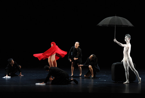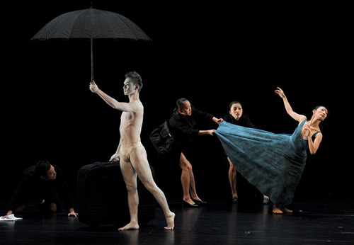 上半場的最后一個作品是布拉瑞揚的《出游》,這部作品頗具超現(xiàn)實的意味,舞者仿佛徘徊在陰陽的臨界點。在舞蹈中年輕美麗的女子被迫重復(fù)穿衣、脫衣、再穿衣的動作,為她的生命儀禮做準備,也讓穿著肉色緊身衣的她,顯得脆弱又神秘。四名黑衣侍者在她身旁忙碌盤旋,一位如鬼魅般的天使,撐著黑傘,拖著皮箱,慢步穿越舞臺。當女子終于投降時,一匹白布覆蓋她全身。四位侍者褪去黑色大衣,舞動欲望,隨之將白粉拋向高空,形成飄蕩的云霧,隨后死亡的女子消失無蹤。