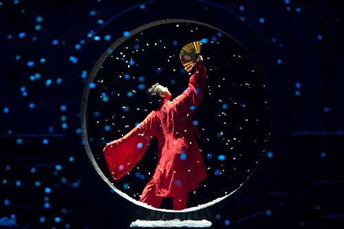 而結(jié)尾更是堪稱神來之筆:蒼寒日暮,漫天飛雪,貧病交加的老年魏蓮生倒在雪地之中。悠揚的音樂聲起,一襲紅衣的余少群,輕攜一把折扇,突然從舞臺后面的月亮門中翩躚而至,在雪地中踏歌起舞。耀眼的紅衣,映襯著潔白的雪花,魏蓮生外化的精魂就此生生不息。