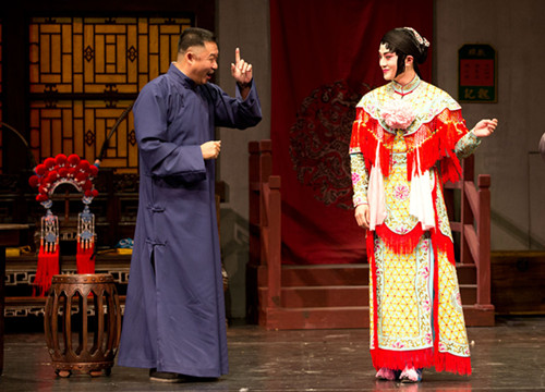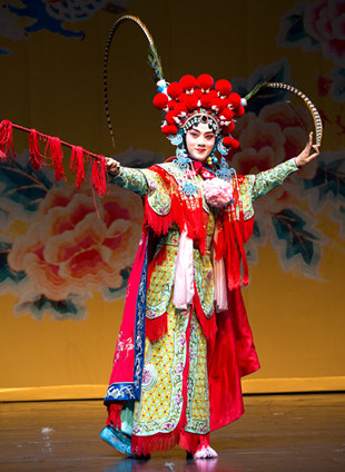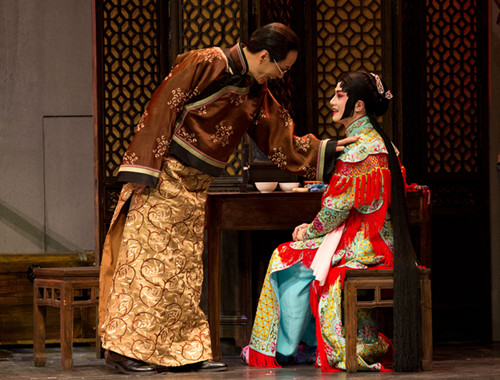 序幕結(jié)束后,燈光漸漸亮起,一塊金色“守舊”從天而降,密集的鑼鼓點中,一襲武旦裝扮的余少群盛裝亮相,名伶的悠然自得躍然舞臺之上。在隨后的劇情發(fā)展中,他對貧困百姓的仗義相助、經(jīng)過玉春點撥后的懵懂猶疑、最終相約出走的希望滿懷以及最終事態(tài)敗露后的無怨無悔,這一系列的人物心理線索,余少群全部一氣呵成地詮釋完滿,不露絲毫雕琢痕跡。而配合情節(jié)發(fā)展穿插其中的戲曲功底展露,更是為角色增光添彩,京劇武旦戲《昭君出塞》、昆曲《游園驚夢》,雖然只是短短幾句唱腔與身段表現(xiàn),但名伶風范即刻呈現(xiàn)。