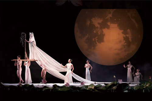 《九歌》中李名覺從林懷民強調(diào)的楚地水澤繁花的意象出發(fā),在視覺上大量運用了荷花的元素。他引用臺灣前輩畫家林玉山在1930年創(chuàng)作的畫作《蓮池》,一手打造了巨幅荷花繪景,創(chuàng)造出荷葉荷花滿天的景像。而劇院的樂池也被別出心裁地注入了真的池水,化為水汪汪的池塘,田田荷葉托出粉色荷花,始終在舞者與觀眾之間搖曳生姿。