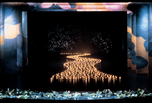 《九歌》的舞美設計由與貝聿銘齊名的美籍華人設計泰斗李名覺擔任,他被譽為“美國舞臺設計界一代宗師”,他為《九歌》所創(chuàng)作的視覺效果獲得了1996年紐約舞蹈與表演藝術設計獎。