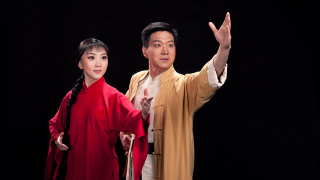 梅派青衣丁曉君飾演吳清華(左)、奚派老生演員張建峰飾演洪常青(右)