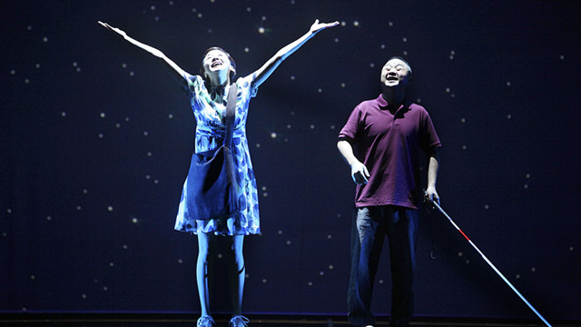 此次,國家大劇院在話劇制作領(lǐng)域繼《簡愛》、《風(fēng)雪夜歸人》后首次推出現(xiàn)實(shí)主義題材作品《推拿》。9月5日該劇在大劇院的首演亮相中,編劇喻榮軍、導(dǎo)演郭小男、舞美設(shè)計(jì)黃楷夫等實(shí)力主創(chuàng)呈現(xiàn)給了觀眾一個(gè)“逼真”的盲人世界。舞臺(tái)戲劇表演空間由一個(gè)長方形的空間構(gòu)成,隨著劇情的需要,轉(zhuǎn)變成推拿房、醫(yī)院、盲人推拿師們的宿舍等區(qū)域,黑白灰構(gòu)成的主色調(diào)讓觀眾直觀地體驗(yàn)到了盲人所面對的單調(diào)、逼仄的外在環(huán)境,而和舞臺(tái)形成鮮明對比的是婀娜多彩的多媒體投影。在劇中,每一位盲人各自都有不愿提及的“盲史”,正是這些記憶和經(jīng)歷塑造了人物的性格和內(nèi)心。這些慣常戲劇手法難以展示的故事正是通過多媒體投影得以實(shí)現(xiàn),從而令劇中的角色有了立體感。有灰色、紅色的抽象變幻、有在彩色草原上飛馳的小馬、有如梵高的油畫般粼粼的水波,還有滿屏的黑白盲文像眼淚一樣逐個(gè)濺落……多媒體設(shè)計(jì)王之綱說:“多媒體存在的意義在于輔助表達(dá)盲人內(nèi)心想象的絢麗,但這一手法我們用得很有節(jié)制,因?yàn)樵谖枧_(tái)上戲劇表演才是主體?!?