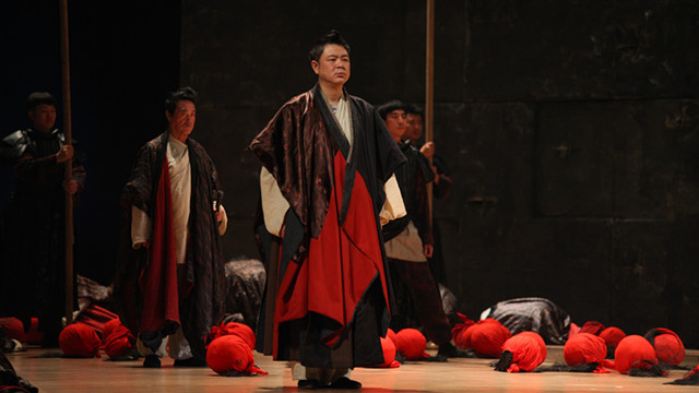 為了能將濁古的氣蘊(yùn)和宏大的場(chǎng)面表現(xiàn)到位,舞臺(tái)視覺總監(jiān)易立明,現(xiàn)代藝術(shù)家王音用兩面粗糙的城墻把整個(gè)舞臺(tái)分割成了倒梯形,故意突出的透視感使舞臺(tái)顯得更有震懾力。城墻上也是機(jī)關(guān)重重,有可以開合的暗門,也有隨時(shí)可以推出、收回的巨型尖木樁,此外,真刀真槍的運(yùn)用也令廝殺場(chǎng)面更為真實(shí)和殘酷——士兵們站在一面城墻上突然萬(wàn)箭齊發(fā),甚至能讓前排的觀眾看得心驚膽寒。