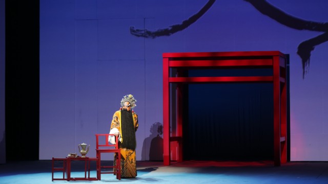 大幕拉開伊始,四位穿著傳統(tǒng)服裝的檢場將傳統(tǒng)道具“一桌二椅”在舞臺上一字排開,隨后隨著機械、投影和燈光的巧妙運用,真實大小的一桌二椅逐漸隱去,取而代之的是一套朱紅色巨大的“一桌二椅”在舞臺中心逐漸聳立起來,“一桌”正對觀眾的一面覆蓋以一層宣紙,隨著燈光的輔助,傳統(tǒng)皮影在宣紙形成的“屏幕”之上生動地表現(xiàn)出“克段”的戰(zhàn)爭場面,古代戰(zhàn)爭場面用充滿水墨國畫味道的大寫意方式中被展現(xiàn)得靈氣十足,而后隨著鏗鏘音樂的響起,宣紙幕布上的皮影漸漸疊加變幻成真實演員們的身影,一眾扎靠武生與刀馬旦在幕后奮力廝殺,并最終爆發(fā)力十足地破紙而出,在眾人的簇擁中,鄭莊公、潁考叔、公子呂也正式登臺亮相。