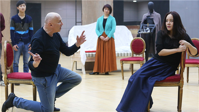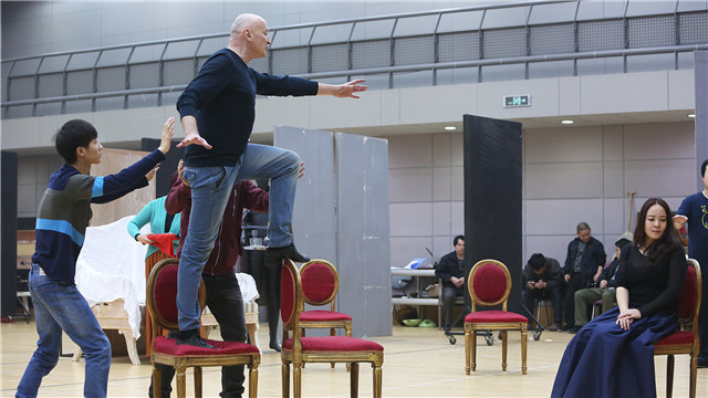 導(dǎo)演阿列克謝·斯捷潘紐克在排練現(xiàn)場為演員講戲 肖一/攝