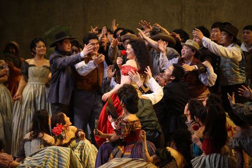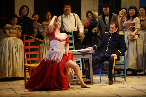 《卡門》作為法國歌劇的扛鼎之作,不僅是世界上演最多的歌劇之一,同時,作為全球各歌劇院的保留劇目,《卡門》在各種歌劇榜上更長期名列前五或前三名,每次上演都備受矚目。國家大劇院在2010年歌劇節(jié)強力打造的新版《卡門》,由國際當紅導演弗朗切斯卡·贊貝羅執(zhí)導,并力邀英、法、美、等六國的藝術(shù)家聯(lián)袂創(chuàng)作,組成了一支不折不扣的“跨國團隊”。如燈光設計本杰明·皮爾西就是聞名遐邇的2004年《大河之舞》全球巡演的的燈光設計及監(jiān)制。
