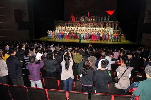 演出結(jié)束后,臺(tái)上臺(tái)下齊聲同唱《沒有共產(chǎn)黨就沒有新中國(guó)》 凌風(fēng)/攝