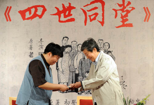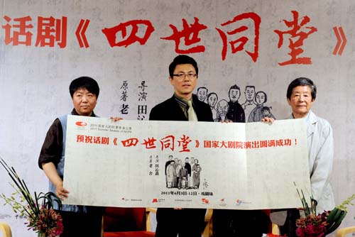 5月26日,在老舍長(zhǎng)女、老舍紀(jì)念館館長(zhǎng)舒濟(jì),導(dǎo)演田沁鑫,國(guó)家大劇院演出部副部長(zhǎng)孟鑫等出席的新聞發(fā)布會(huì)現(xiàn)場(chǎng),記者了解到,這部由中國(guó)國(guó)家話劇院、北京演藝集團(tuán)有限責(zé)任公司、北京市西城區(qū)人民政府、北青文化藝術(shù)公司、北京兒童藝術(shù)劇院股份有限公司強(qiáng)強(qiáng)聯(lián)手打造,北京巨龍文化公司全程策劃推廣,各主辦方整合優(yōu)質(zhì)資源、按照市場(chǎng)規(guī)律精心運(yùn)作打造的話劇,籌劃之時(shí)理想的首演劇場(chǎng),正是國(guó)家大劇院。而在老舍長(zhǎng)子、原中國(guó)現(xiàn)代文學(xué)館館長(zhǎng)舒乙以“導(dǎo)演好,演員好,舞臺(tái)調(diào)度好,這個(gè)戲立住了!”評(píng)價(jià)該劇之后,舒濟(jì)也在現(xiàn)場(chǎng)肯定田沁鑫的改編,并接受田沁鑫贈(zèng)送的即將出版的新書(shū)《田沁鑫的排練場(chǎng)——四世同堂》樣書(shū)。