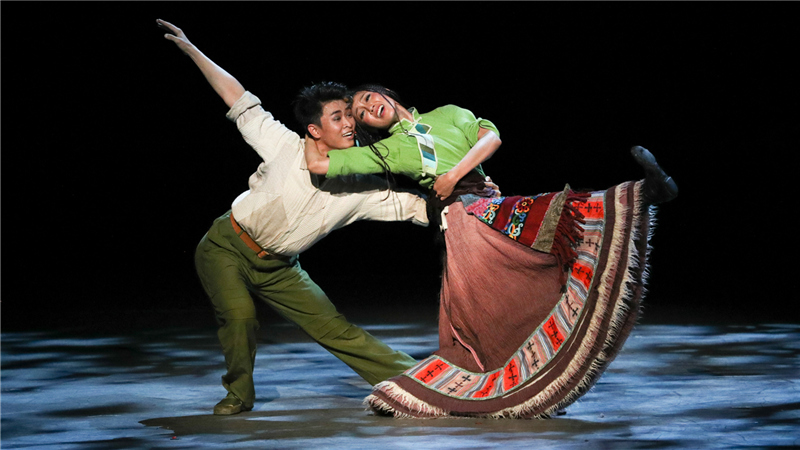 由馮敬雅飾演的姐姐央金與由黎星飾演的筑路人盧天奉上雙人舞“情愫”