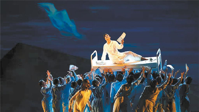 ??整場表演中,簡潔現(xiàn)代、隱喻豐富的舞臺呈現(xiàn)極富沖擊力。展現(xiàn)冼星海在異國流亡經(jīng)歷的第三幕“故土”,尤其令人印象深刻。伴著節(jié)拍器的“滴答”響聲,他的生命樂章進入倒計時。冼星海反復(fù)攀爬三角結(jié)構(gòu)裝置的斜坡,試圖抓住象征國境線的紅線,卻屢次滑落,20余位群舞演員形成人墻“國境線”,在舞臺上不停地順時針轉(zhuǎn)動,一次次將他與家鄉(xiāng)無情阻隔,也表現(xiàn)著生命的日漸流逝。紅色燈光、白色雪片從舞臺上空傾瀉而下,充滿了視覺和情感張力。